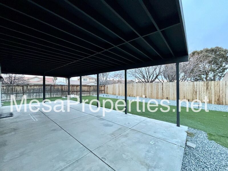 The backyard is designed for easy enjoyment, featuring a large covered patio and turf landscaping, perfect for relaxing or entertaining with minimal maintenance required.