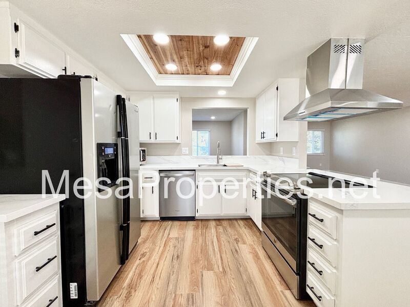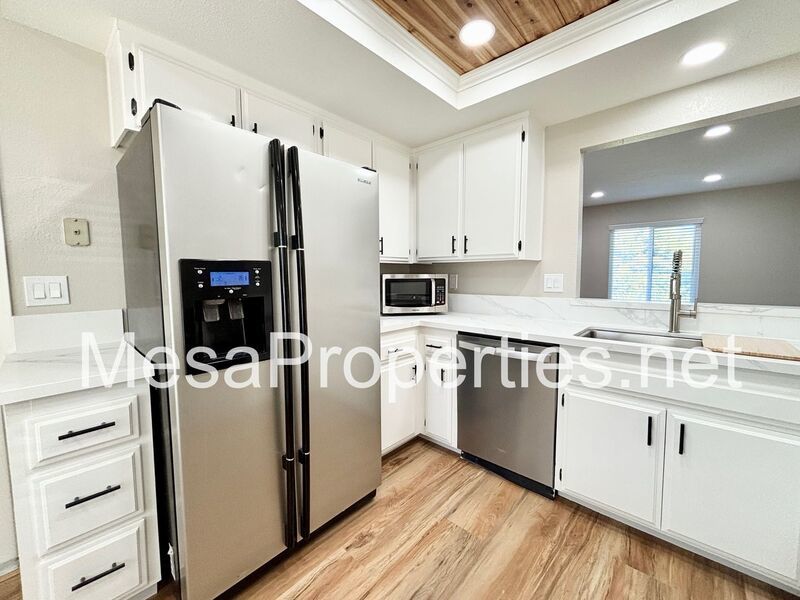 Inside, enjoy new flooring, fresh paint, updated countertops, modern lighting, and blinds throughout. The open living and dining area features a cozy fireplace and easy access to the backyard, perfect for entertaining. The kitchen comes fully equipped with a range, dishwasher, refrigerator, and microwave.